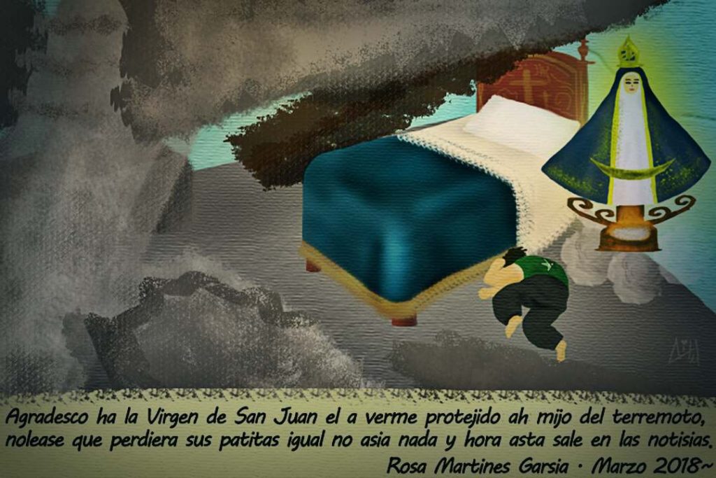 Exvoto dedicado a la Virgen de San Juan, Quien protegió a Juanito durante el sismo del 19s, sobreviviendo por semanas bajo los escombros; milagro que sólo puede explicarse mediante la fe, al menos hasta que pasen por esta ruta jugando la Novela Visual.